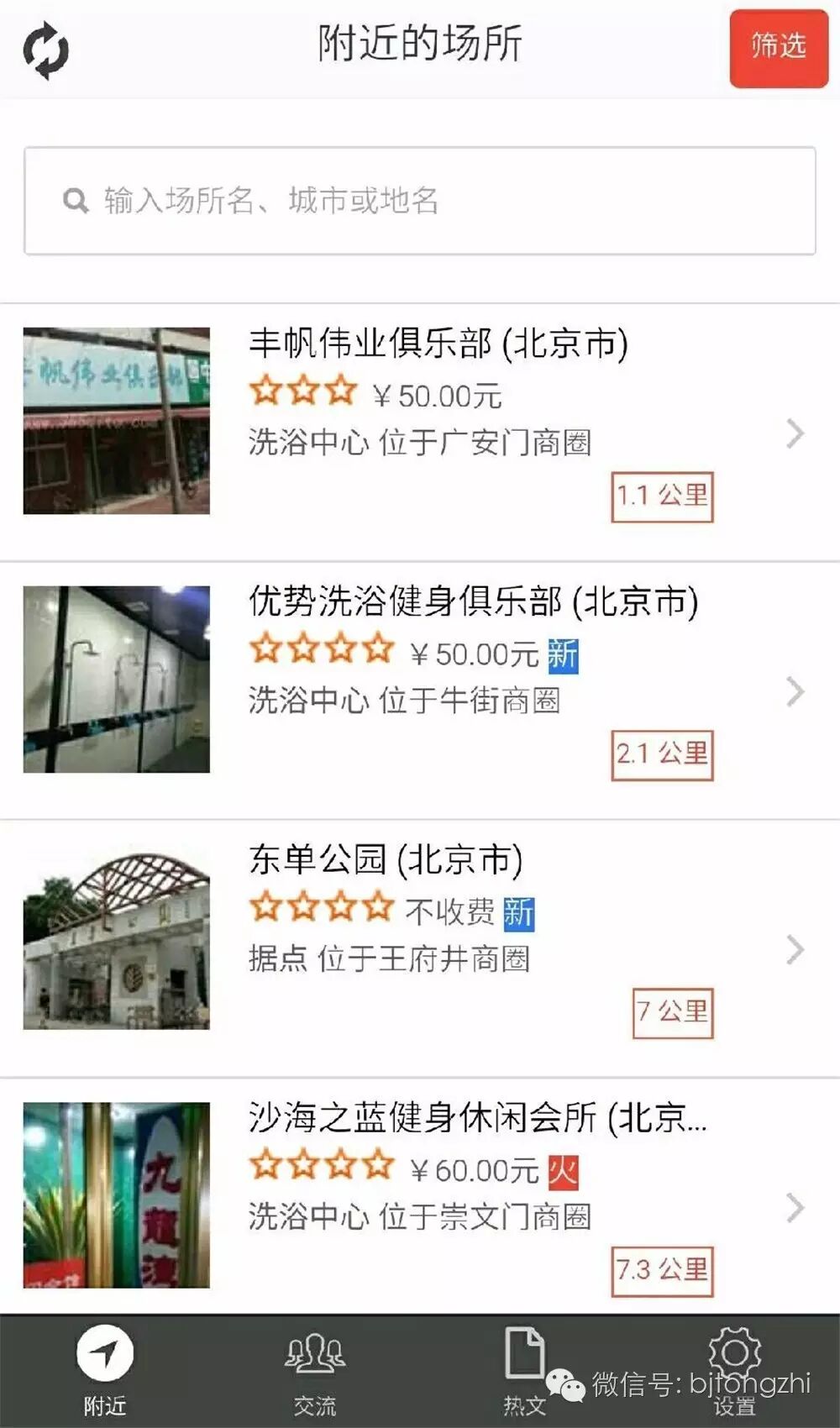 “附近”栏目可以根据您的位置挑选出距离您最近的同志场所的名称、路线图、消费价格参考、电话、图文简介、网友的评价等等;