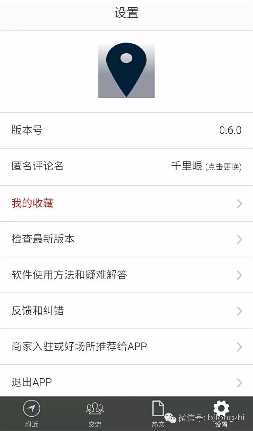 “设置”栏目可以与APP的制作者提供您的想法、查看您的收藏场所、查看帮助以及更改自己的昵称等等。